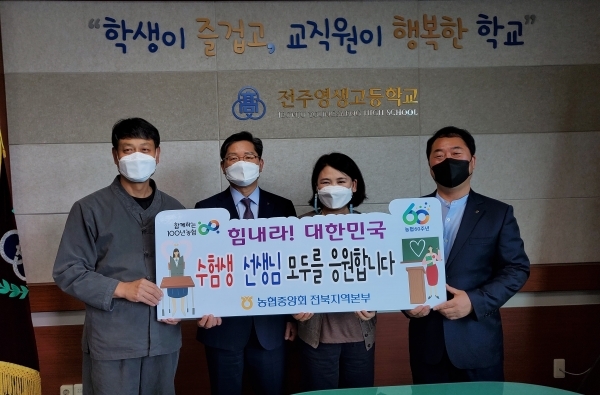 전북농협(본부장 정재호)은 13일 영생고등학교(교장 이장훈)를 방문해 우리 쌀로 만든 떡과 식혜 등을 전달하며 포스트 코로나 시대에 힘겹게 수능 준비 중인 학생들과 교사를 응원했다.
