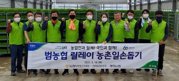 농협 부안군지부(지부장 조인갑) 전북검사국(국장 이문구), 계화농협(조합장 이석훈) 임직원 등 20여명은 18일 계화농협 벼 공동육묘장을 찾아 ‘농협 창립 60주년 기념’ 릴레이 농촌 일손돕기를 실시했다.