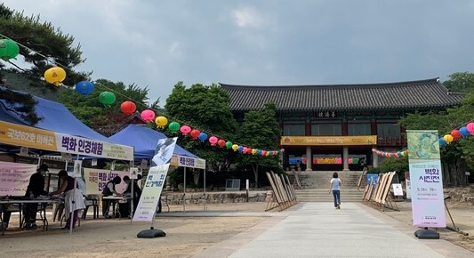 ‘국보 제62호 미륵전 벽화’가 불기 2565년 부처님 오신 날을 맞아 금산사 경내 성보박물관 앞마당에 전시돼 방문객들의 발길을 잡았다.