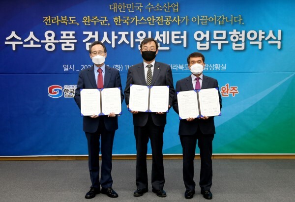 전북도와 완주군, 한국가스안전공사는 지난 18일 전북도청에서 ‘수소 용품 검사지원센터’ 건립을 위한 업무협약을 체결했다.