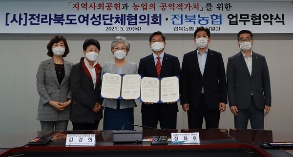 전북농협(본부장 정재호)은 20일 (사)전라북도여성단체협의회(회장 김경희)와 농협전북지역본부에서 양 기관이 보유한 자원과 역량을 활용해 국민의 행복증진과 지역사회 기여하기로 업무협약을 체결했다.