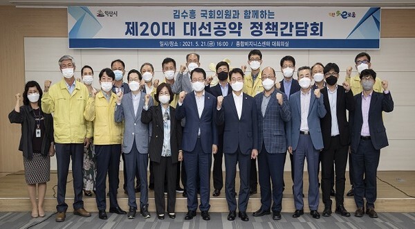 시는 21일 종합비즈니스센터에서 정헌율 시장을 비롯한 간부 공무원과 김수흥 국회의원, 보좌관 등이 참석한 가운데 ‘제20대 대선공약 정책간담회’를 가졌다.