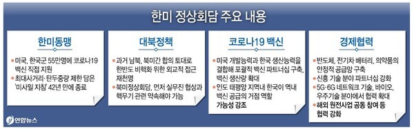 특히 양국은 공동 성명에서 미국이 가진 백신의 기술, 원부자재 공급 능력과 한국이 가진 생산 능력을 결합한 ‘포괄적인 한미 글로벌 백신 파트너십’을 구축키로 합의했다.