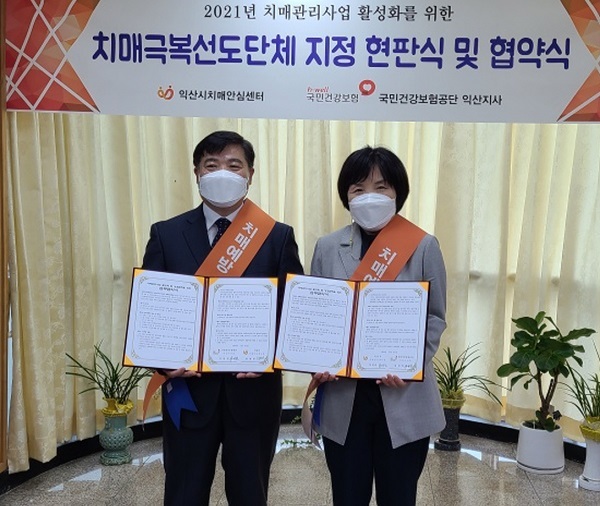 익산시 치매안심센터는 25일 치매 친화적 환경조성을 위한 치매극복선도단체로 국민건강보험공단 익산지사를 지정하고 업무협약을 체결했다.
