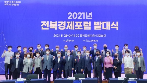전북도와 전북연구원이 26일 전북도청 대회의실에서 급변하는 경제환경 변화에 대응하고 정책 방향 논의를 위한 전북 경제 포럼 발대식을 개최했다.