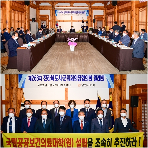전라북도 시·군의회 의장협의회(회장 강동화 전주시의회 의장)는 27일 남원예촌에서 제263차 월례회를 열고 국립공공보건의료대학원 설립 촉구 결의안을 채택했다.