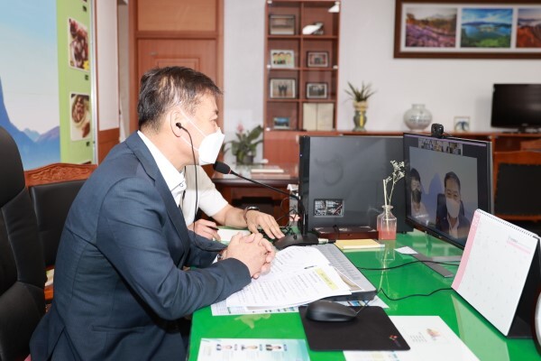 전춘성 군수 등 진안지역 관계자들은 지난 28일 군수실에서 일본 ‘아야정’의 수장인 ‘모니타 마나부’ 정장을 비롯한 교류 관계자들을 영상으로 만나 온라인 국제 간담회를 실시했다고 밝혔다.
