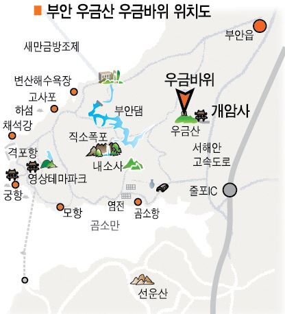부안 우금바위 일원은 부안의 대표적인 관광지로 우금산에 위치하며 주변에 개암사를 비롯해 우금산성 등의 명소가 있다.