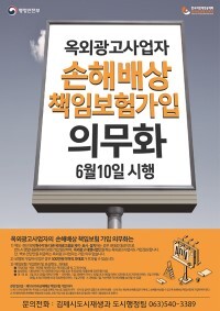 김제시는 개정된 법령에 따르면 옥외광고사업자는 옥외광고물 손해배상 책임보험 및 이와 유사한 내용이 포함된 보험에 반드시 가입해야 한다고 밝혔다.