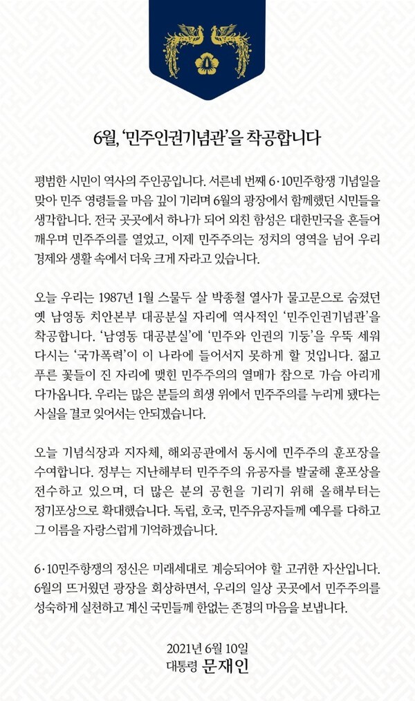 또한 “6·10 민주항쟁의 정신은 미래세대로 계승돼야 할 고귀한 자산”이라며 “우리의 일상 곳곳에서 민주주의를 성숙하게 실천하고 계신 국민들께 한없는 존경의 마음을 보낸다”고 했다.