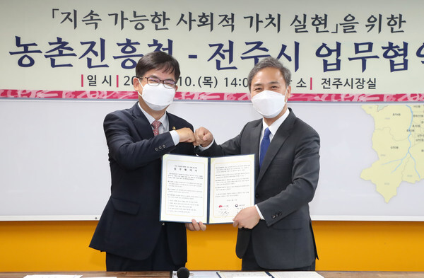 김승수 전주시장과 허태웅 농촌진흥청장은 10일 전주시장실에서 노인·장애인 일자리 창출 등 지속가능한 사회적 가치 실현을 위한 업무협약을 체결했다.