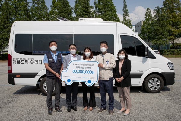 현대자동차 전주공장(공장장 문정훈) 노사가 지난 11일 전라북도 내 소외지역 학대아동 상담을 돕기 위해 굿네이버스 전북지역본부에 이동상담용 중형버스 1대를 쾌척했다.