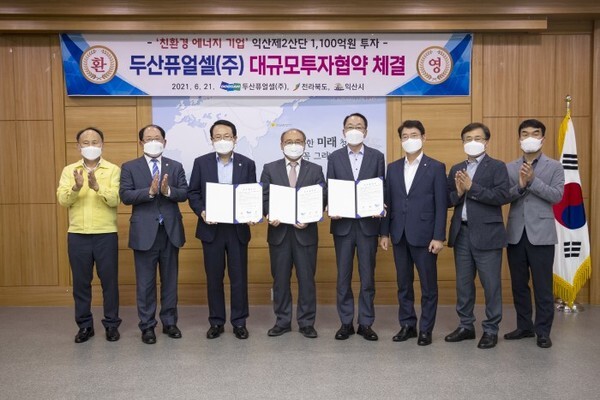정헌율 익산시장과 두산퓨얼셀(주) 유수경 대표는 21일 익산시청에서 김수흥 국회의원, 유재구 시의장, 전북도 우범기 정무부지사 등이 참석한 가운데 증설 투자협약을 체결했다.