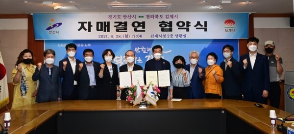 김제시(시장 박준배)와 경기 안산시(시장 윤화섭)는 지난 28일 자매결연 협약을 체결하고 두 도시의 공동번영과 상호교류를 통한 상생발전을 위해 협력키로 했다.