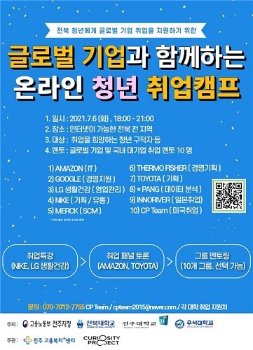 고용노동부 전주지청(지청장 전현철)은 글로벌 기업과 해외 취업을 희망하는 청년구직자를 지원하기 위해 오는 6일 오후 6시부터 9시까지 ‘글로벌기업과 함께하는 온라인 청년취업캠프’를 온라인(비대면)으로 개최한다고 지난 30일 밝혔다.