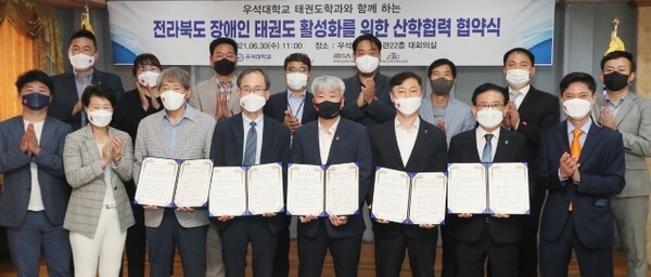 우석대학교(총장 남천현) 산학협력단이 전라북도 장애인 태권도 활성화를 위해 전라북도장애인체육회·대한장애인태권도협회·전라북도장애인태권도협회와 업무협약을 체결했다.