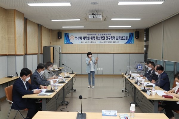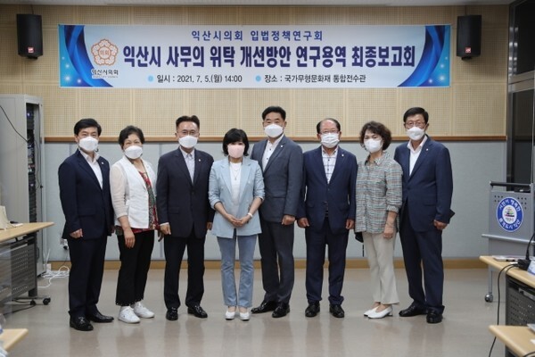 익산시의회 의원연구단체인 ‘입법정책연구회(대표의원 김경진)’는 5일 무형문화재 통합전수관에서 ‘익산시 사무의 위탁 개선방안 연구용역’ 최종 보고회를 개최했다.