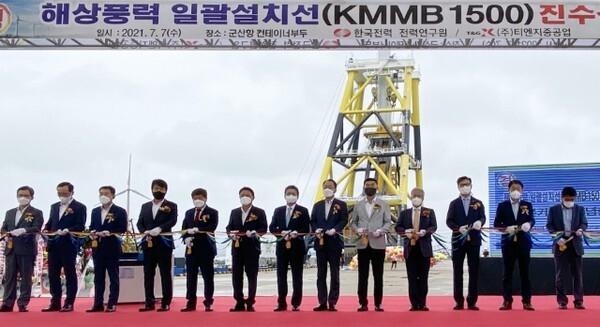 전북도는 7일 우범기 정무부지사와 정승일 한국전력공사장, 강임준 군산시장, 박상진 한국기계연구원장, 김규선 티에지중공업 대표 등 관계자들이 참여한 가운데 해상풍력 일괄 설치선(MMB) 진수식을 개최했다고 밝혔다.