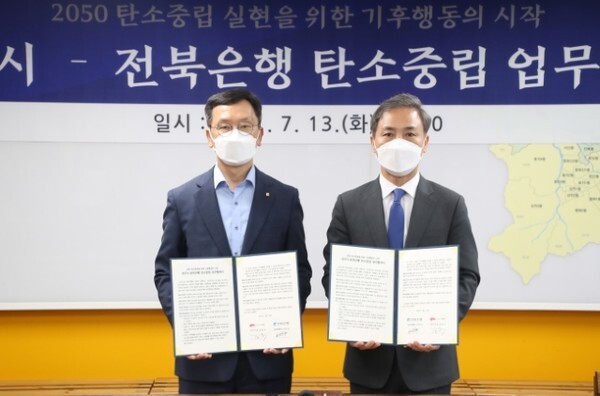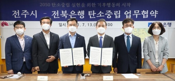전주시(시장 김승수)와 전북은행(은행장 서한국)이 13일 전주시장실에서 ‘전주시-전북은행 탄소중립 업무협약’을 체결했다.