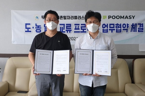 13일 무주군 농어촌일자리플러스센터(센터장 최일섭)와 서울시 농촌 일자리 지원 사업을 추진 중인 ㈜푸마시(대표 김용현)가 도농상생을 위한 업무협약을 맺고 농촌일자리 플랫폼 구축 지원, 농촌 일자리 창출에 역량을 모으기로 약속했다.