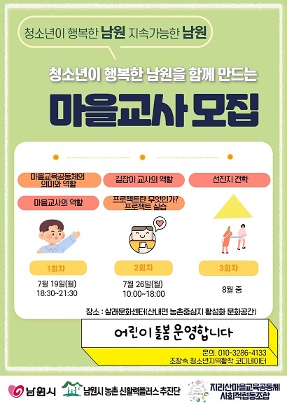 마을교사 교육은 오는 17일과 26일, 다음달 중 하루 등 3회차에 걸쳐 남원시 산내면 농촌중심지 활성화 문화공간 살래문화센터에서 열린다.