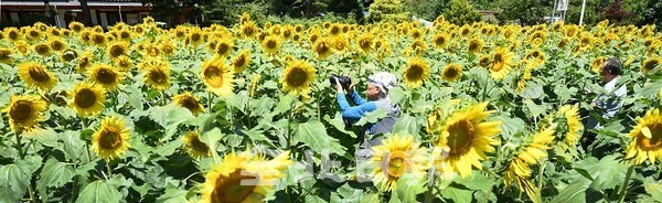폭염속에 완주군 위봉마을에는 해바라기 꽃이 만개해 20일 사진작가들이 해바라기꽃을 카메라에 담고 있다.