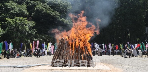 대한불교 조계종 전 총무원장 월주(月珠) 큰스님의 영결식이 열린 26일 김제 금산사 연화대에서 다비식이 거행되고 있다.
