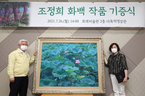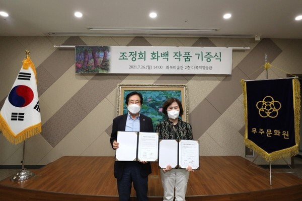 맹갑상 문화원장은 “조정희 작가의 이번 기증은 무주군 문화예술 발전에 좋은 본보기가 될 것”이라며 “장기간 코로나19로 힘들어하고 있는 군민들께서 작품을 보면서 생활의 여유를 찾았으면 하는 바람이다”고 전했다.