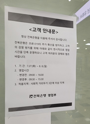 28일 전북은행 등 전북 도내 시중은행에 따르면 정부의 비수도권 거리두기 3단계 시행 지침에 따라 지난 27일부터 8월 8일까지 영업시간을 오전 9시 30분부터 오후 3시 30분까지 1시간 단축 운영하기로 했다.