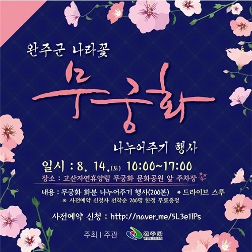 무궁화 도시 완주군(군수 박성일)이 고산자연휴양림 무궁화 문화공원에서 8월 14일 나라꽃 무궁화 나눠주기 행사(드라이브 스루 방식)를 진행한다.