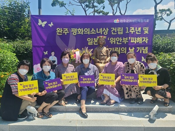 완주군 여성단체협의회(회장 천경욱)가 지난 13일 완주군 삼례읍 책마을 앞에 설치된 ‘완주 평화의 소녀상’을 찾아 위안부 피해 어르신들의 삶을 회고하며 나라사랑과 함께 그들을 기억하고 기념하는 시간을 가졌다.