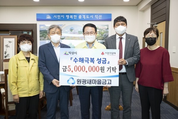 원광새마을금고(이사장 성시종)는 17일 정헌율 익산시장을 방문해 중앙동 일대 침수 피해 상인들을 위해 써 달라며 수해복구 성금 500만원을 쾌척했다.