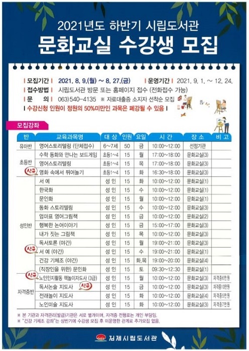 김제시립도서관에서는 하반기 문화 교실 수강생을 오는 27일까지 선착순으로 모집한다.