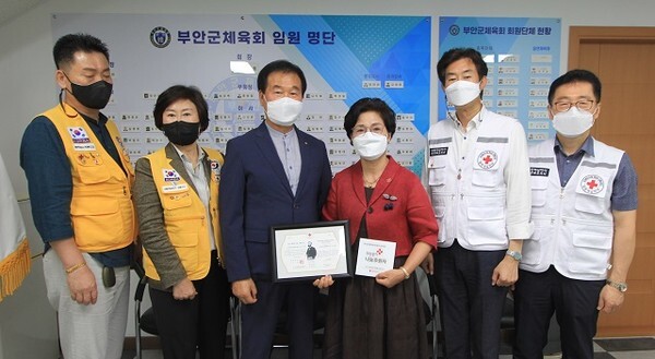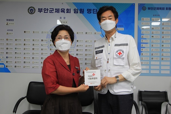 부안군체육회에서 진행된 이번 행사에서 전북적십자사 권영일 사무처장은 김두례 부회장에게 감사의 뜻을 전하며 ‘희망풍차 나눔명패’와 나눔뱃지, 정기후원가입 확인서를 전달했다.