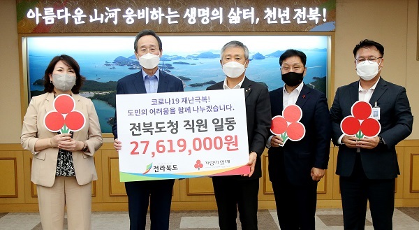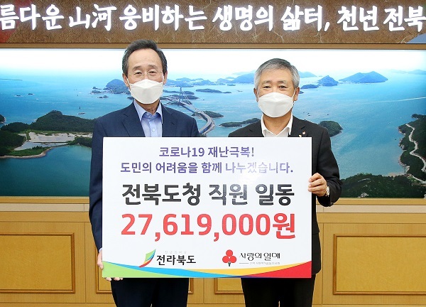 전북도청 직원들이 전북사회복지공동모금회에 특별성금을 기탁하며 도민들의 코로나19 극복에 힘을 보탰다.