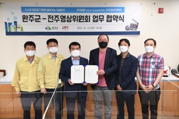 이날 완주군과 (사)전주영상위원회는 양 기관의 연계를 통한 상호발전과 우호증진을 다지고, 다양한 장르의 국내외 영상물이 완주에서 제작 및 촬영 될 수 있도록 홍보 마케팅과 유치 활동에 공동 노력하기로 했다.
