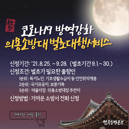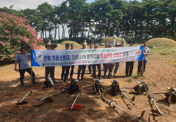 전북소방본부(본부장 김승룡)는 코로나19 확산방지를 위한 ‘의용소방대 벌초 대행 서비스’를 무료로 실시한다고 22일 밝혔다.