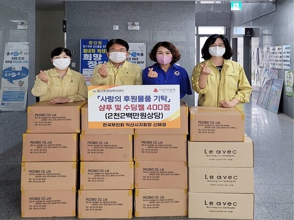 신혜경 한국부인회 익산시지회장은 23일 동산동행정복지센터를 방문해 샴푸, 수딩젤 등 2200만원상당의 생활용품을 기탁했다.
