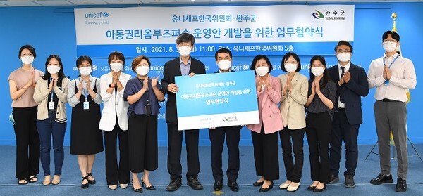 완주군은 30일 유니세프한국위원회 이기철 사무총장과 박성일 완주군수 등 10여명의 관계자가 참석한 가운데 한국위원회와 아동권리 옴부즈퍼슨 운영안 개발을 위한 업무 협약을 전국 처음으로 체결했다.