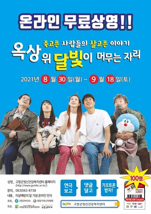 고창군정신건강복지센터(센터장 김완철)가 자살예방의 날(9월10일)을 맞아 오는 18일까지 홈페이지를 통해 온라인 연극 ‘옥상위 달빛이 머무는 자리’를 상영한다