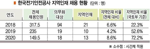부풀리기 현상은 한국전기안전공사에서 뚜렷하게 나타났다. 공사는 지난 2018년 상반기 전국단위 모집에서 본부별 모집으로 변경해 지역인재 규정을 본사와 전북본부에만 적용하고 있다. 이에 따라 의무화 대상은 2018년부터(94명→19명→18명) 감소했다. 2년간 채용된 지역인재도 2018년 대비 10명가량 줄었지만 채용률은 해마다 30.3%p, 19.6%p 늘어 지난해 72.2%를 기록했다.