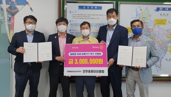 전주동로타리클럽은 이날 협약 체결과 함께 최근 주택 화재로 큰 피해를 당한 봉동읍의 한 가구에 화재복구비 300만 원을 지원하는 전달식도 가졌다.