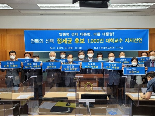 전북지역 교수 1100인이 더불어민주당 대선주자인 정세균 전 총리 지지선언을 했다.