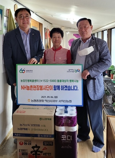 농협 익산시지부(지부장 이종림)와 서익산농협(조합장 임철석)은 7일 농협 창립 60주년을 기념해 익산시 함라면에서 취약 돌봄 대상자 5명을 선정해 생필품을 지원하는 등 취약농업인 지원사업을 펼쳤다.