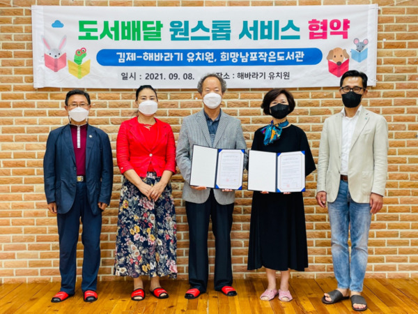김제해바라기 유치원(원장 홍주화)과 희망 남포 작은 도서관(관장 오윤택)은 9일 책 읽는 유치원 및 독서문화 확산을 위한 도서배달 원스톱 서비스 협약식을 가졌다.
