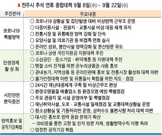전주시가 추석 연휴기간 동안 코로나19 방역을 강화하고 각종 시민불편을 해소하기 위한 종합대책을 가동한다.