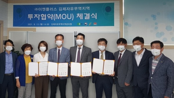 13일 ㈜이엔 플러스 박종성부회장은 김제시 강해원부시장과 전라북도 투자금융과장, 이범천 김제자유무역지역관리원장이 참여한 가운데 투자협약서(MOU)에 서명했다.