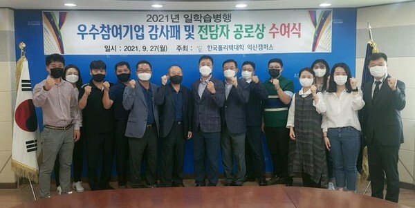 한국폴리텍대학 익산캠퍼스(학장 이창열)는 27일 ‘2021년 일학습병행 우수참여기업 감사패 및 전담자 공로상 수여식’을 개최했다.