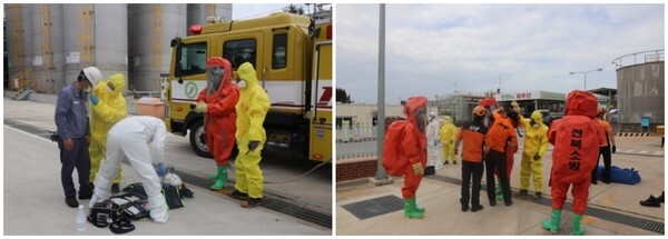 이번 훈련은 공장 등에서 유해화학물질(염산)이 누출된 상황을 가상하여 인원 40명을 비롯해 유해물질 분석기 등 첨단장비 7종과 차량 4대가 투입돼 출동중 취급 물질에 대한 정보 공유 및 대응방법 전파, 유해화학물질 사고 유형별 표준대응절차 훈련, 화학물질 누출사고 대처방법(인명구조,제독 및 잔류오염도 측정,공정 안정화)숙지 등 다양한 프로그램으로 진행됐다.