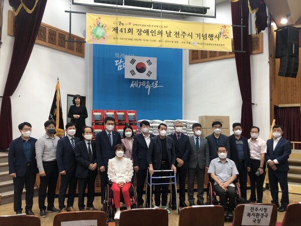 코로나19 여파로 최소인원만 참석하는 등 방역수칙을 준수한 가운데 열린 이날 기념식에서는 장애인 복지 증진에 기여하고 봉사활동에 헌신한 시민과 유공자에 대한 표창과 장학금 전달식이 진행됐다. 또 전주시장애인단체총연합회에서 준비한 라면 1000박스와 쌀 122포 전달식도 이어졌다. 전달된 라면과 쌀은 지역 내 10개 장애인단체, 100가정에 후원될 예정이다.